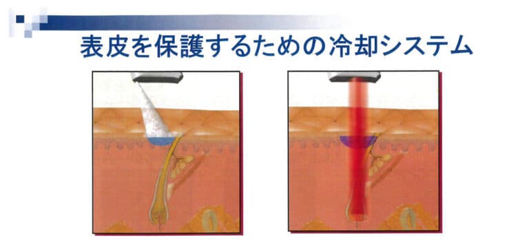 多くは、輪ゴムではじかれるような刺激がありますが、当院で使用する米国キャンデラ社製のGentle Max Pro Plus(ジェントルマックス プロ プラス)は冷却装置がついており、レーザー照射直前に-27℃の冷却ガスが噴射され、皮下1mmを冷やします。表皮を熱損傷から守り、痛みを抑えます。